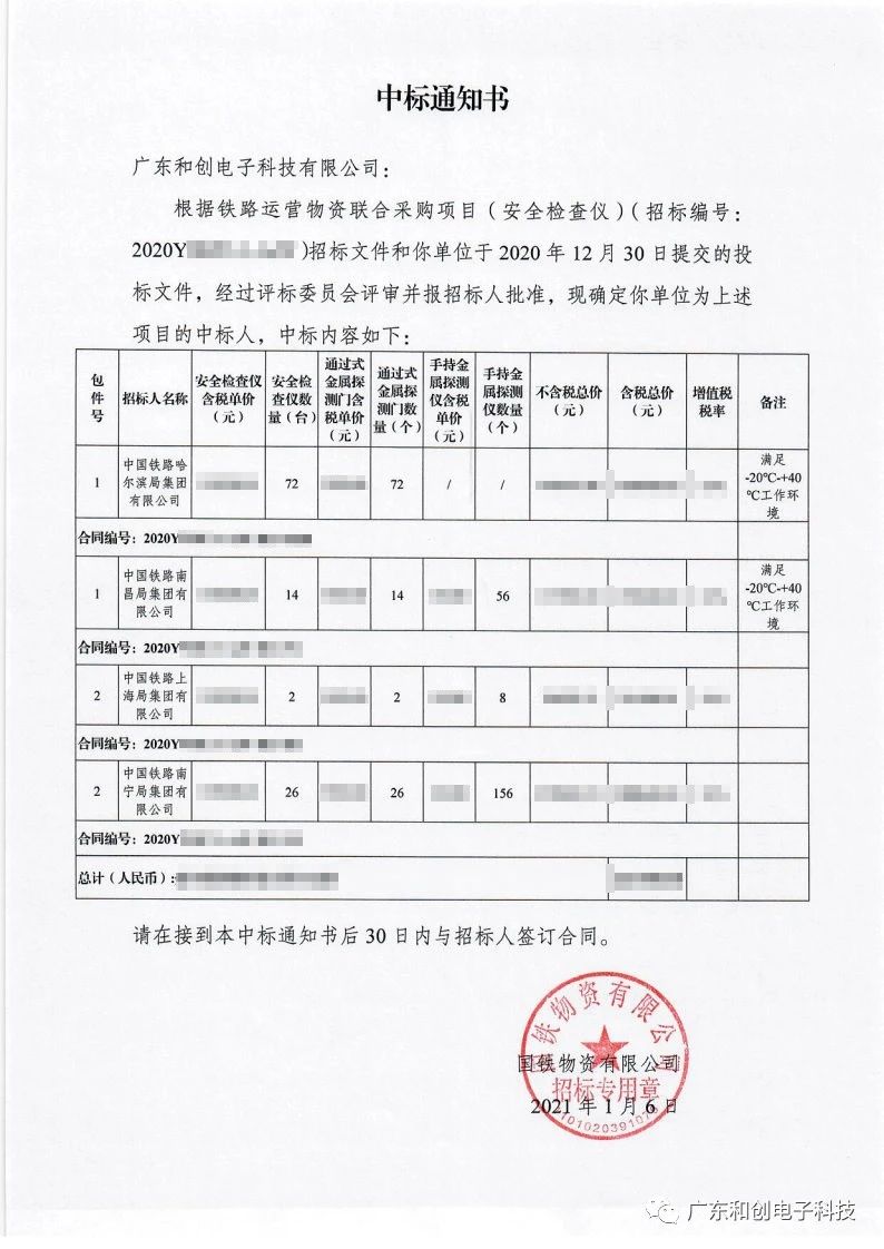 国家铁路集团总公司,公开招标铁路安全检查仪,在经过激烈的竞争之后,广东和创电子科技有限公司凭借良好的产品质量和优异的服务质量中标此次采购项目。中标安全检查设备,包括:“X光行李安检机、金属探测门、手持金属探测仪”。今后的一段时间和创电子需要为中铁哈尔滨局、南昌局、上海局和南宁局这四家铁路局提供中标通知书中所提到的所有安全检查仪。